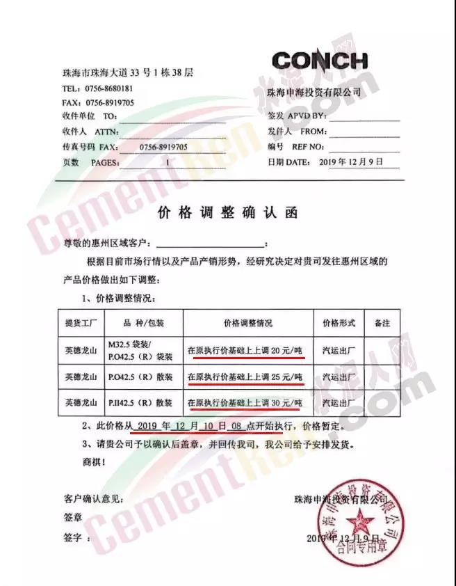 同時(shí),福建區(qū)域也迎來(lái)了新一波的價(jià)格上漲,福建春馳集團(tuán)新豐水泥有限公司通知自2019年12月12日零時(shí)起,發(fā)往省內(nèi)各區(qū)域,各規(guī)格型號(hào)袋、散裝水泥出廠價(jià)格在原來(lái)的基礎(chǔ)上,上調(diào)30元/噸。