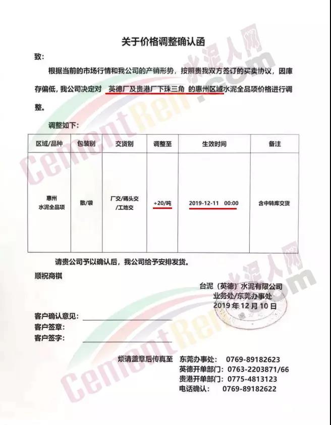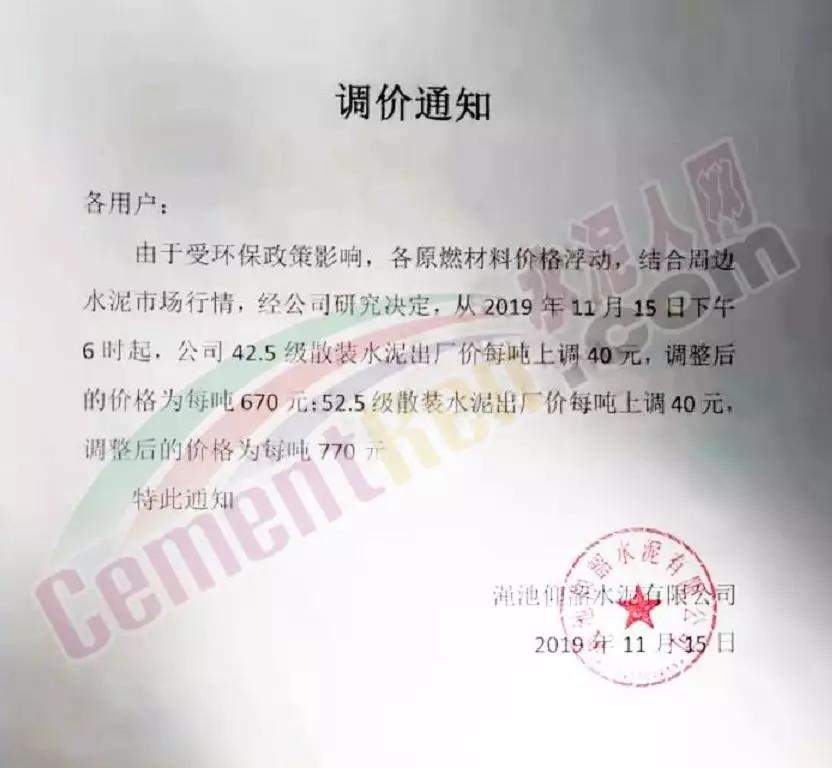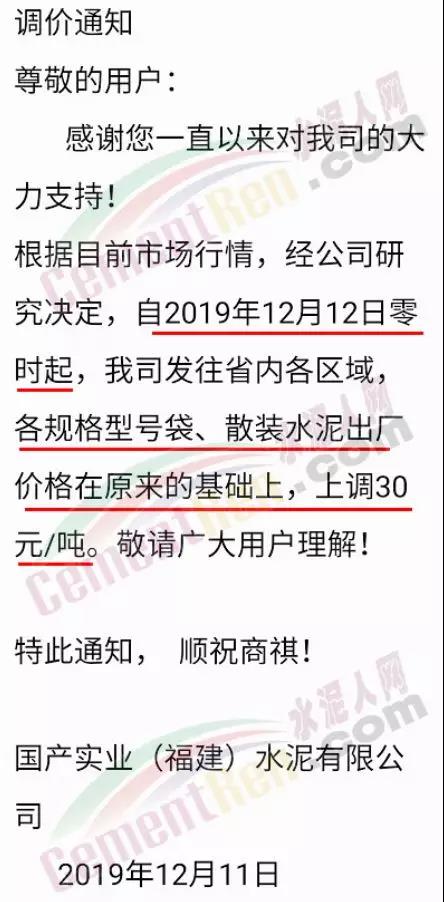 根據(jù)近期市場(chǎng)行情變化,我公司決定于2019年12月12日起,所有品種散裝、袋裝水泥出庫(kù)價(jià)在原有基礎(chǔ)上調(diào)30元/噸。順祝商祺!【福建鼎日實(shí)業(yè)有限公司】