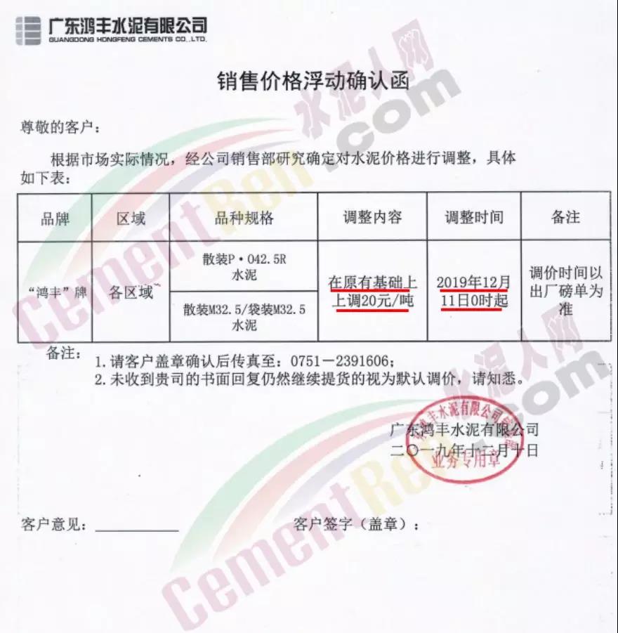 12月11日五華縣眉山水泥有限公司發(fā)調(diào)價(jià)函稱,因原材料價(jià)格不斷大幅上漲,為調(diào)節(jié)產(chǎn)品供求,經(jīng)公司研究決定,自2019年12月12日零時(shí)起,公司所有等級(jí)袋裝,散裝水泥出廠結(jié)算單價(jià)在現(xiàn)有價(jià)格基礎(chǔ)上,上調(diào)30元/噸。