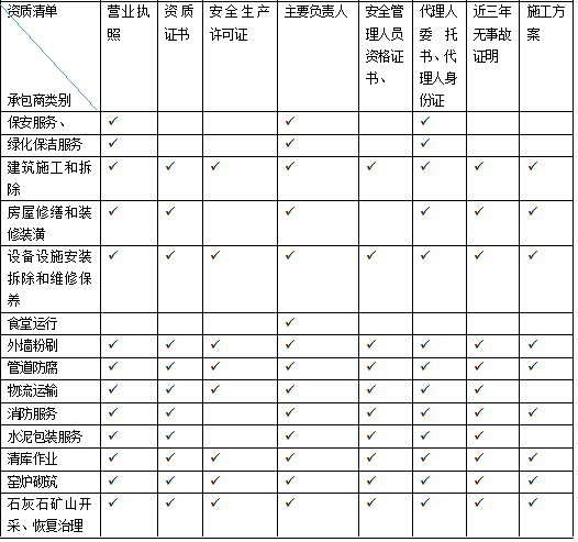 為便于各企業(yè)在審核時掌握情況,給出一份各類承包商資質(zhì)清單供參考: