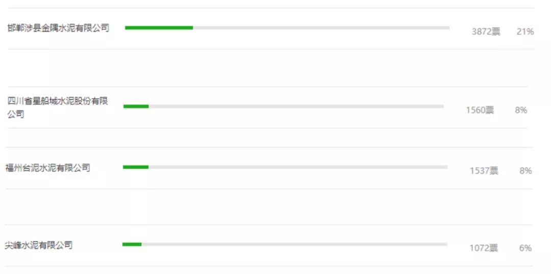 一、邯鄲涉縣金隅水泥3872票。二、四川星船城水泥股份有限公司1560票。三、福州臺(tái)泥水泥有限公司位居前三位1537票。四、尖峰水泥1072票。五、漢中西鄉(xiāng)堯柏水泥有限公司988票。六、曲寨水泥有限公司883票。七、邢臺(tái)金隅冀東水泥有限公司874票。八、華潤(rùn)水泥(彌渡)有限公司808票。九、陜西富平生態(tài)水泥有限公司806票。十、貴定海螺盤江水泥有限責(zé)任公司764票。