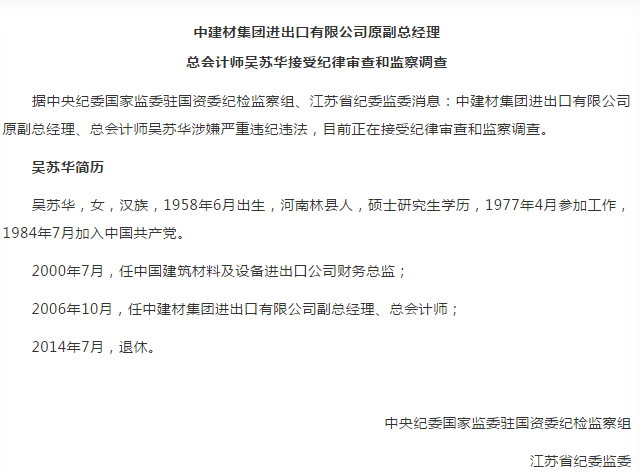 據(jù)中央紀(jì)委國家監(jiān)委駐國資委紀(jì)檢監(jiān)察組、江蘇省紀(jì)委監(jiān)委消息:中國建材集團有限公司副總經(jīng)理黃安中等2人接受紀(jì)律審查和監(jiān)察調(diào)查。