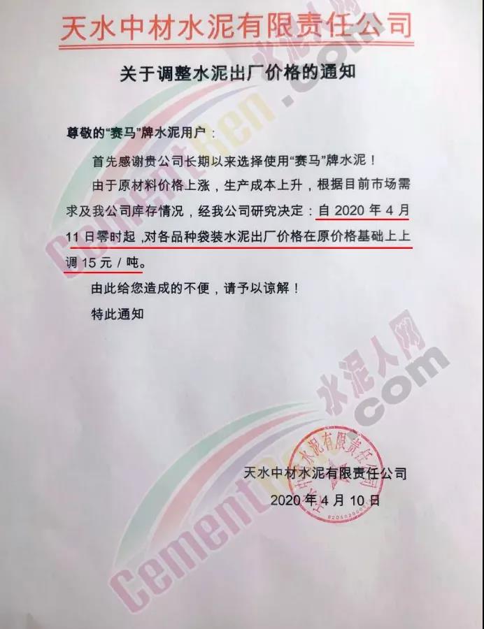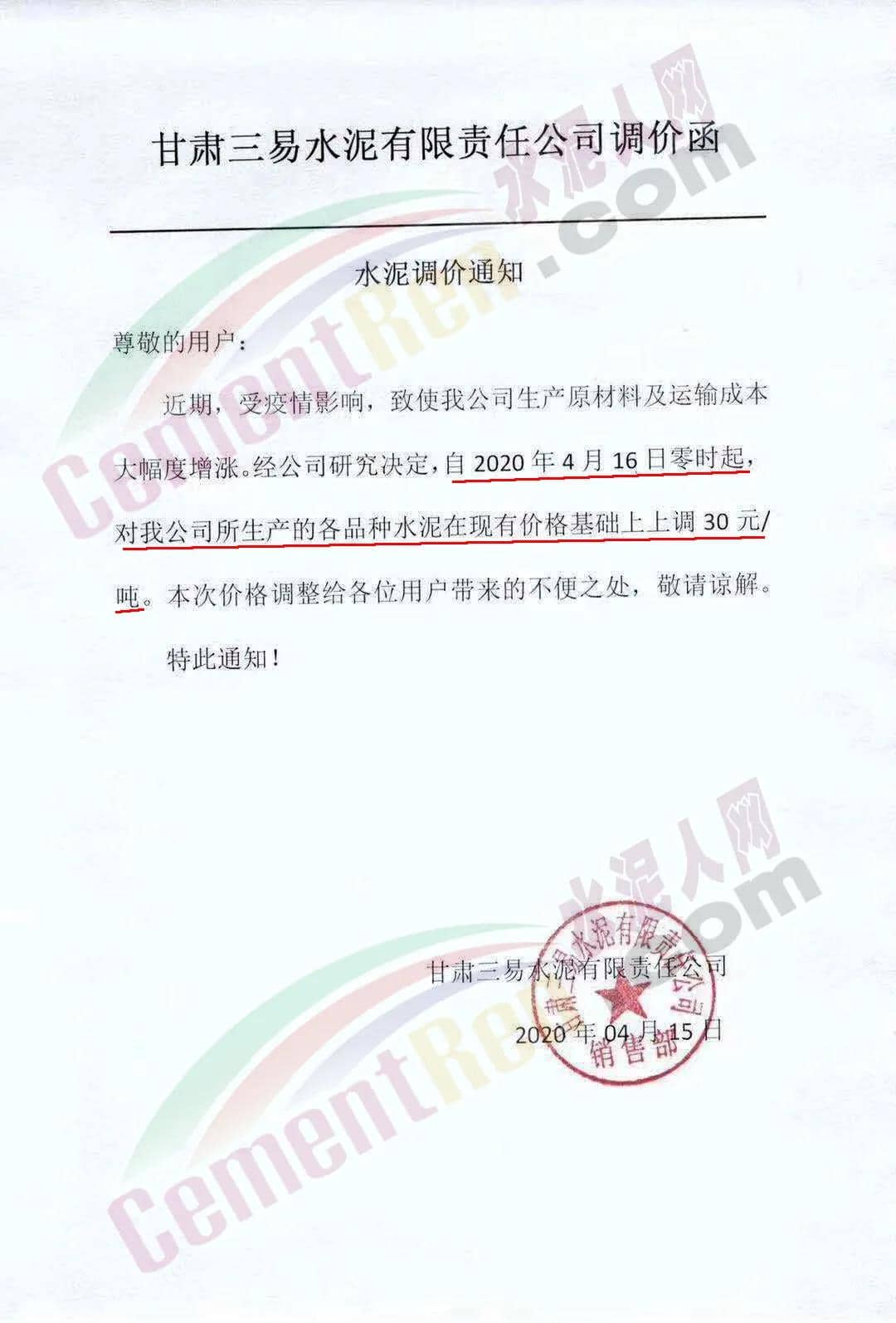 甘肅三易水泥有限責(zé)任公司調(diào)價(jià)通知稱,受疫情影響,致使公司生產(chǎn)原材料及運(yùn)輸成本大幅度增漲,經(jīng)公司研究決定自4月16日零時(shí)起,對(duì)公司所生產(chǎn)的各品種水泥在現(xiàn)有價(jià)格基礎(chǔ)上上調(diào)30元/噸。