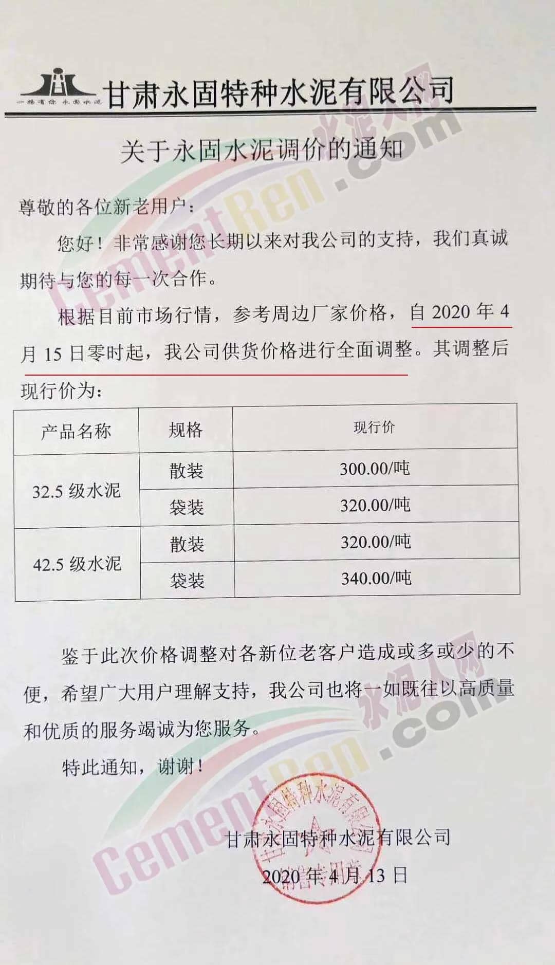 甘肅永固特種水泥有限公司通知稱,根據(jù)目前市場(chǎng)行情,參考周邊廠家價(jià)格,自4月15日零時(shí)起,供貨價(jià)格進(jìn)行全面調(diào)整。調(diào)整后32.5級(jí)袋裝水泥和42.5級(jí)散裝水泥報(bào)價(jià)均為320元/噸。