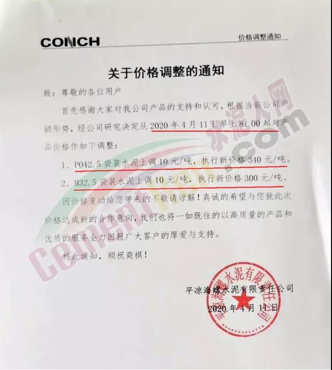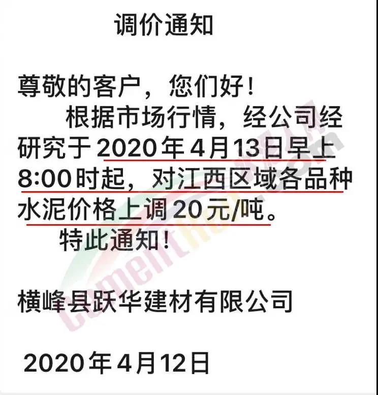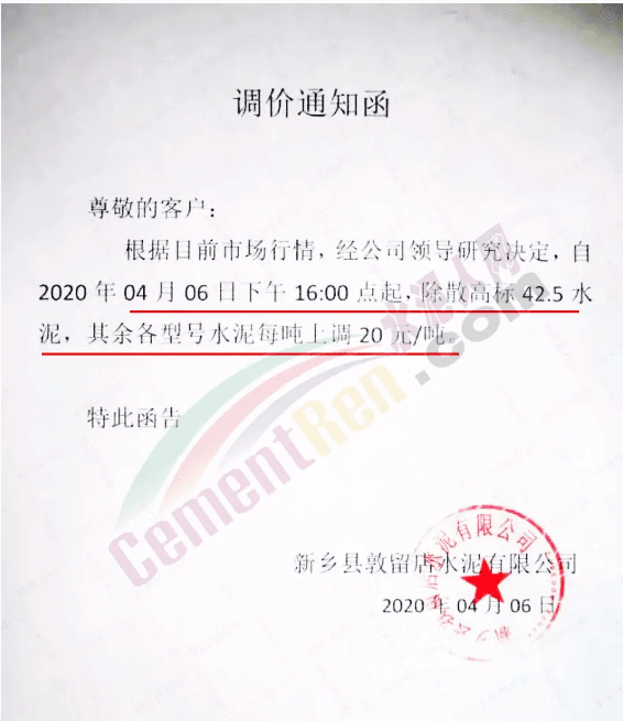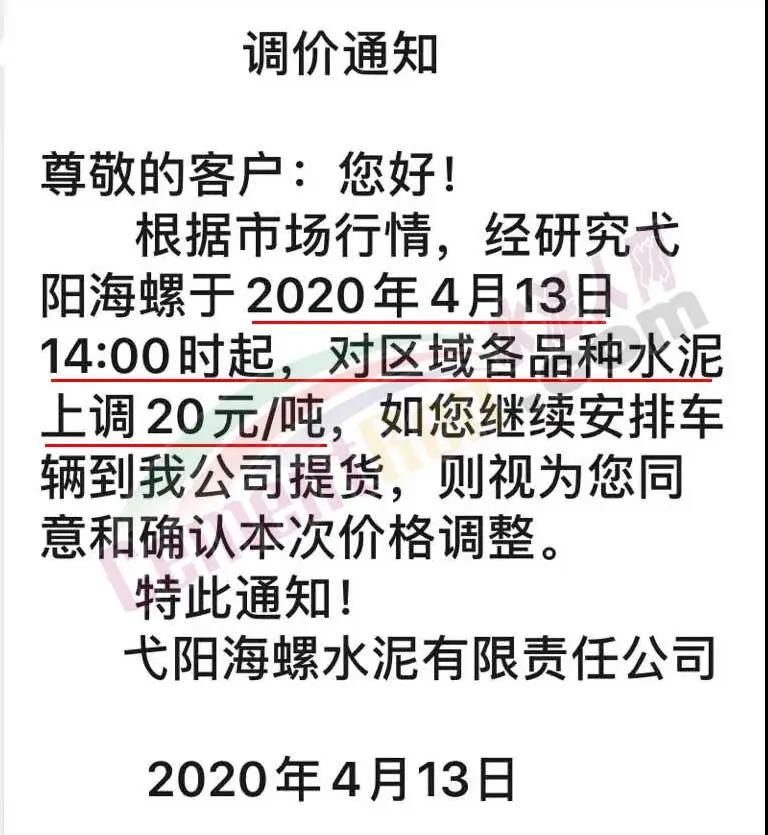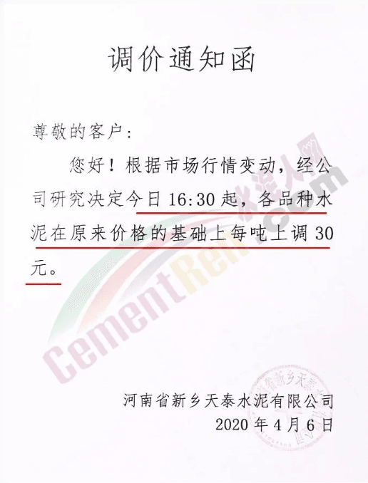4月7日河南同力水泥通知:因省各水泥線錯(cuò)峰停產(chǎn)、環(huán)保提升成本增加,經(jīng)公司研究決定:從2020年4月7日8:30點(diǎn)起,各品種袋、散水泥均上漲20元/噸。