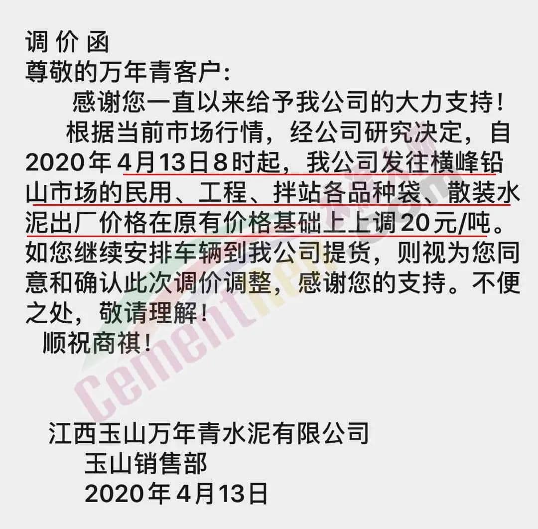 江西玉山萬(wàn)年青水泥有限公司通知自4月13日8時(shí)起,公司發(fā)往橫峰鉛山市場(chǎng)的民用、工程、攪拌站各品種袋、散水泥出廠價(jià)格在原有價(jià)格基礎(chǔ)上上調(diào)20元/噸。