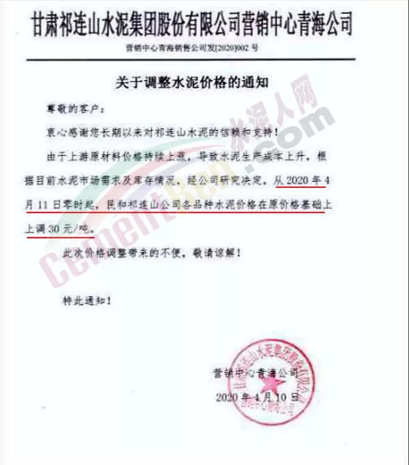 青海民和金圓水泥有限公司通知由于近期原材料價(jià)格上漲,導(dǎo)致水泥生產(chǎn)成本增加,經(jīng)公司研究決定自4月14日零時(shí)起,各品種水泥在原基礎(chǔ)上上調(diào)20元/噸。