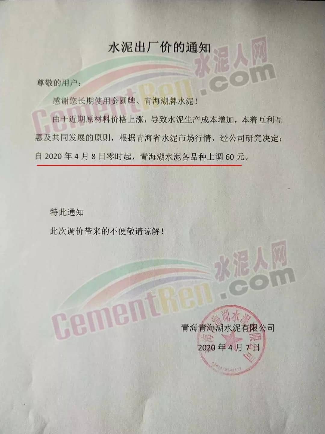 4月7日,青海湖水泥有限公司通知自4月8日零時(shí)起,青海湖水泥各品種上調(diào)60元/噸。