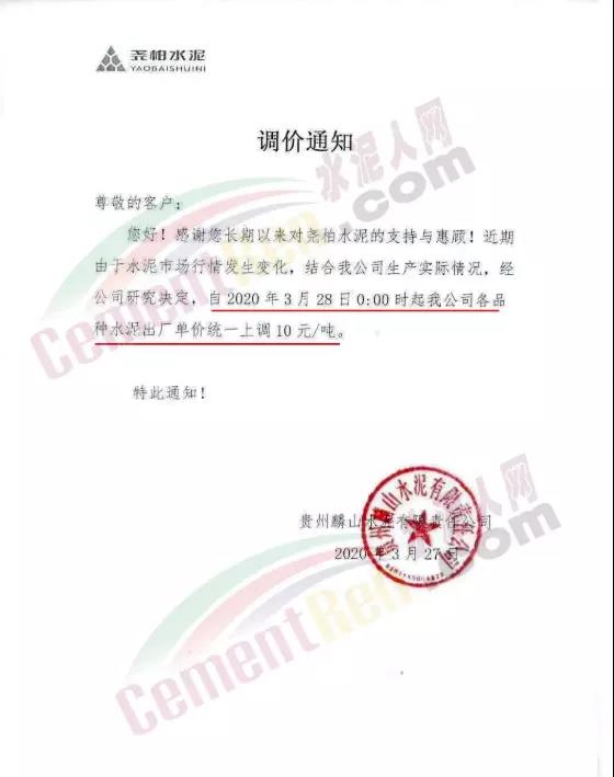 4月初,貴州區(qū)域內(nèi)的西南、海螺等主要水泥廠商陸續(xù)通知上調(diào)水泥出廠價(jià)格10-20元/噸。其中,西南水泥對(duì)各品種水泥出廠價(jià)格上調(diào)20元/噸;海螺針對(duì)袋裝上調(diào)10元/噸、散裝上調(diào)20元/噸。