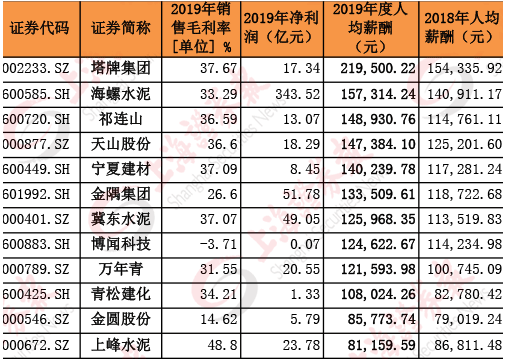以海螺水泥為例,2019年凈利潤超過340億元,銷售毛利率超過33%。水漲船高,海螺水泥高管的薪水去年也普遍上調20萬元-30萬元不等,年薪大都超過了150萬元。