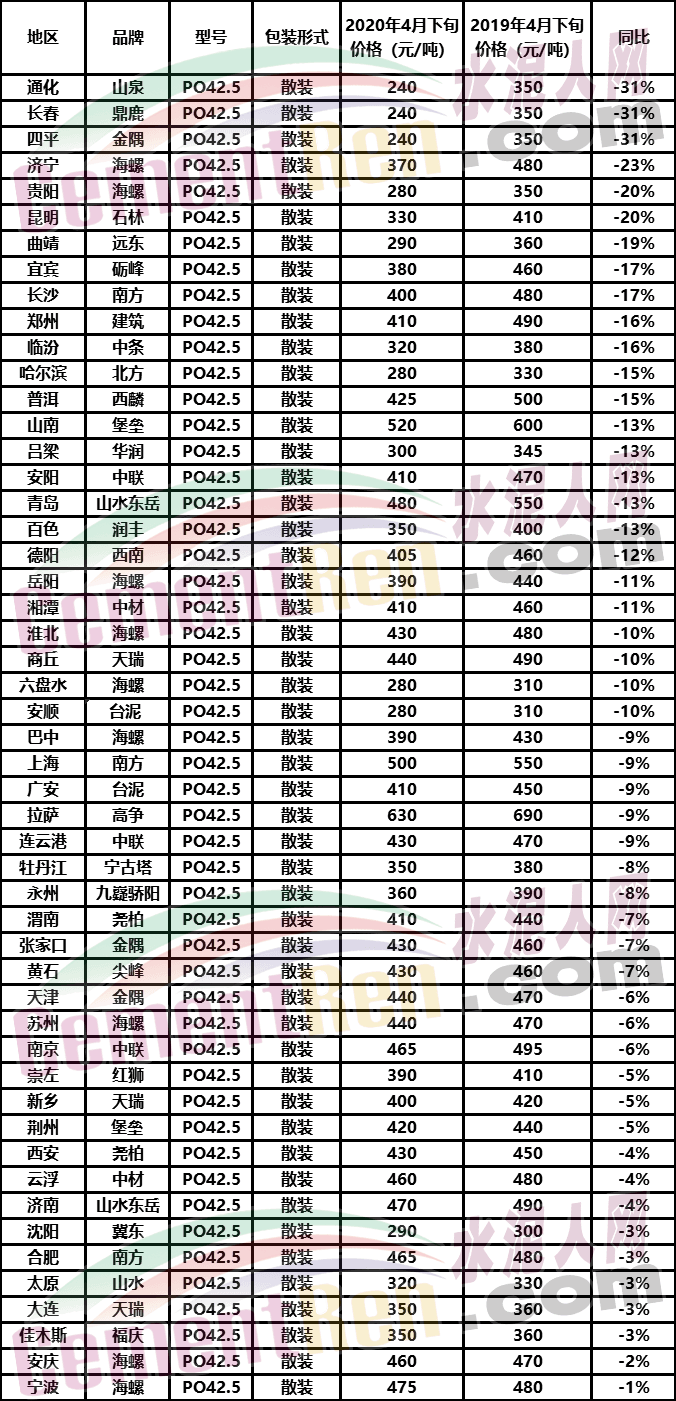 自3月份以來,自西而東、自北而南,全國水泥價格上演一輪又一輪的上漲,這讓很多人產生了錯覺,水泥價格是不是又創(chuàng)造了峰值呢?其實事實并非如此。據水泥人網信息中心數據顯示,截至到4月底,全國50多個地區(qū)水泥價格同比出現了下滑,最大下滑幅度達31%左右,因此,從目前國內水泥價格的發(fā)展來看,部分地區(qū)的水泥價格回升屬于恢復性上漲。