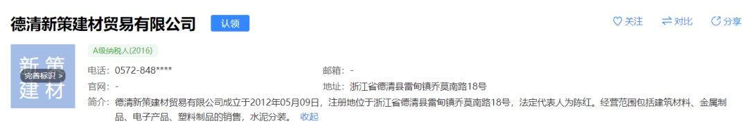 經(jīng)查,德清新策建材貿(mào)易有限公司注冊(cè)地址位于浙江省德清縣雷甸鎮(zhèn)喬莫南路18號(hào),經(jīng)營(yíng)范圍為建筑材料、金屬制品、電子產(chǎn)品、塑料制品的銷售,水泥分裝等。