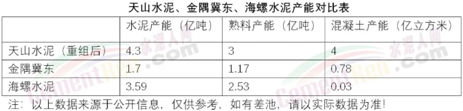重組后的天山水泥相當(dāng)于2.5個(gè)金隅冀東、1.1個(gè)海螺水泥