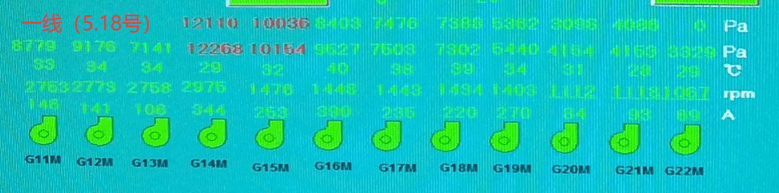 對(duì)比當(dāng)天兩條線12臺(tái)篦冷風(fēng)機(jī)運(yùn)行電流可見(jiàn),在一線熟料產(chǎn)量高于二線的前提下,一線僅有G14風(fēng)機(jī)實(shí)際運(yùn)行電流明顯高于二線(設(shè)計(jì)全壓比二線高1000Pa),G18、G21兩臺(tái)風(fēng)機(jī)電流稍高,但在波動(dòng)范圍內(nèi),其余9臺(tái)風(fēng)機(jī)運(yùn)行電流均比二線對(duì)應(yīng)風(fēng)機(jī)電流低。中控顯示12臺(tái)風(fēng)機(jī)運(yùn)行電流一線篦冷風(fēng)機(jī)較二線篦冷風(fēng)機(jī)低230A以上。
