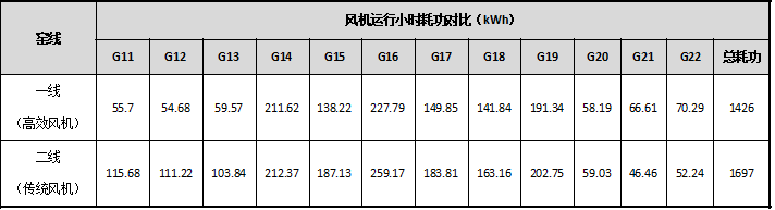工程技術(shù)人員在窯線正常運(yùn)行工況下分別對(duì)兩條線篦冷風(fēng)機(jī)實(shí)際運(yùn)行耗功進(jìn)行了測(cè)算,結(jié)果見(jiàn)下表: