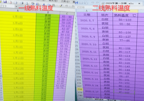 除了對(duì)比兩條線風(fēng)機(jī)運(yùn)行能耗,工程技術(shù)人員還對(duì)比了5月份兩條線正常運(yùn)行后在相同位置測(cè)得的熟料溫度,一線熟料溫度大約50-90℃,二線熟料溫度大約60-120℃,一線熟料溫度明顯低于二線孰料溫度,可見(jiàn)一線冷卻效果好于二線,見(jiàn)下圖。