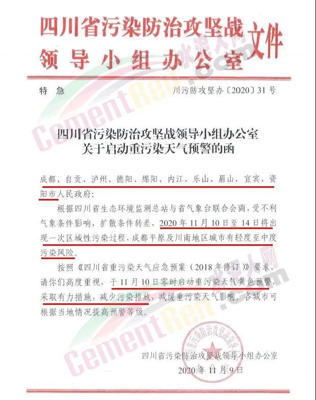 日前,水泥人網從四川省污染防治攻堅戰(zhàn)領導小組辦公室獲悉,11月10日零時,成都、自貢、瀘州、德陽、綿陽、內江、樂山、眉山、宜賓、資陽10市將啟動重污染天氣黃色預警。根據四川省生態(tài)環(huán)境監(jiān)測總站與省氣象臺聯合會商,受不利氣象條件影響,擴散條件轉差,2020年11月10日至14日將出現一次區(qū)域性污染過程,成都平原及川南地區(qū)城市有輕度至中度污染風險。按照《四川省重污染天氣應急預案(2018年修訂)》要求,成都、自貢、瀘州、德陽、綿陽、內江、樂山、眉山、宜賓、資陽應于11月10日零時啟動重污染天氣黃色預警,采取有力措施,減少污染排放,減緩重污染天氣影響。各城市可根據當地情況提高預警等級。