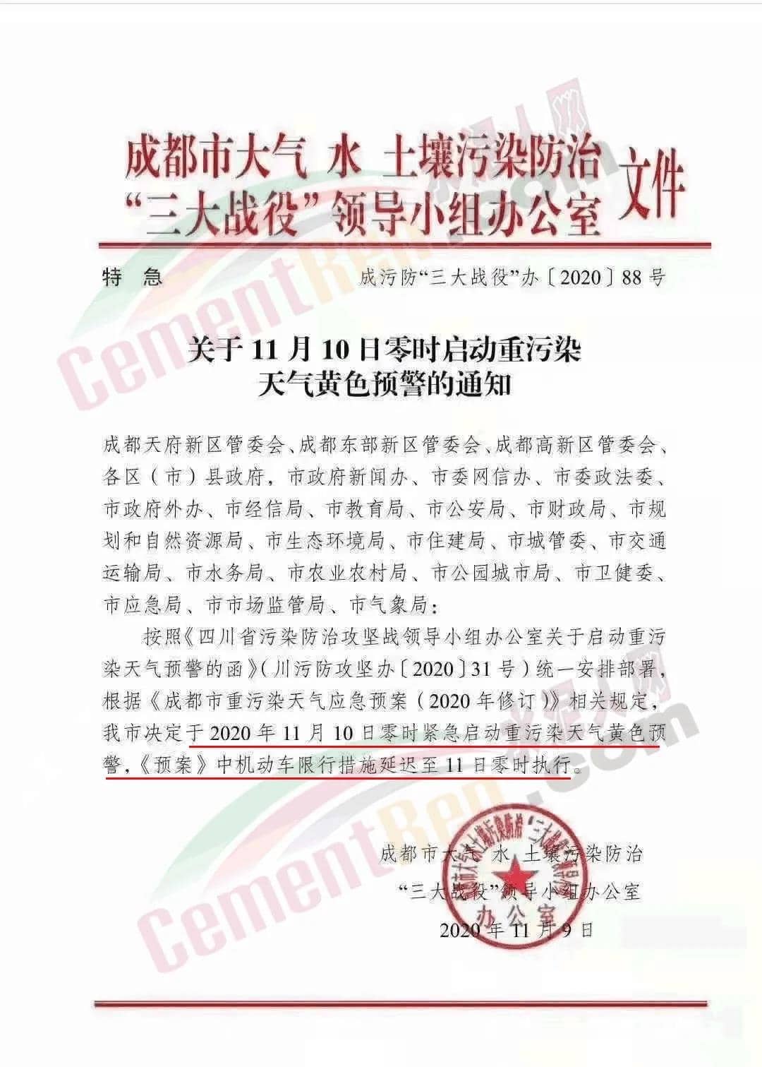 成都市大氣、水、土壤污染防治三大戰(zhàn)役"領導小組辦公室發(fā)布特急文件《關于11月10日零時啟動重污染天氣黃色預警的通知》(成污防"三大戰(zhàn)役"辦〔2020〕88號)稱,按照《四川省污染防治攻堅戰(zhàn)領導小組辦公室關于啟動重污染天氣預警的函》(川污防攻堅辦〔2020〕31號)統一安排部署,根據《成都市重污染天氣應急預案(2020年修訂)》相關規(guī)定,成都市決定于2020年11月10日零時緊急啟動重污染天氣黃色預警,《預案》中機動車限行措施延遲至11日零時執(zhí)行。