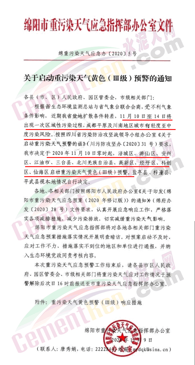 同日,四川綿陽發(fā)布《關于啟動重污染天氣黃色(Ⅲ級)預警的通知》稱,綿市于2020年11月10日零時起,涪城區(qū)、游仙區(qū)、安州區(qū)、江油市、三臺縣、北川羌族自治縣、高新區(qū)、經開區(qū)、科創(chuàng)區(qū)、仙海區(qū)啟動重污染天氣黃色(Ⅲ級)預警。鹽亭縣、梓潼縣、平武縣視本地情況自行決定。各地、各相關部門按照綿陽市人民政府辦公室《關于印發(fā)〈綿陽市重污染天氣應急預案(2020年修訂版)〉的通知》(綿府辦發(fā)〔2020〕28號)文件要求,認真開展應急響應工作,嚴格落實各項減排措施,減少污染排放,切實減緩重污染天氣影響。