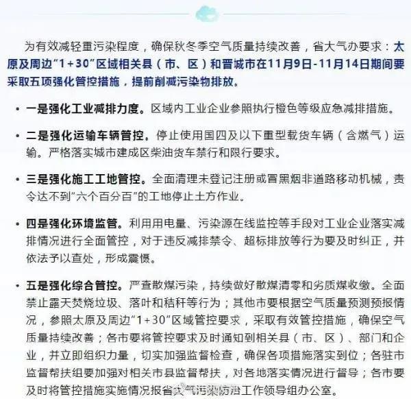 日前,山西省省大氣污染防治工作領導組辦公室印發(fā)《山西省大氣污染防治工作領導組辦公室關于做好近期不利氣象條件應對的通知》指出,根據省生態(tài)環(huán)境監(jiān)測中心與中國環(huán)境監(jiān)測總站、省氣象部門會商預測,從11月9日開始,全省氣象條件轉差,全省大范圍以輕至中度污染為主,太原、陽泉、晉城、運城、臨汾等部分城市短時可能達到重度污染。