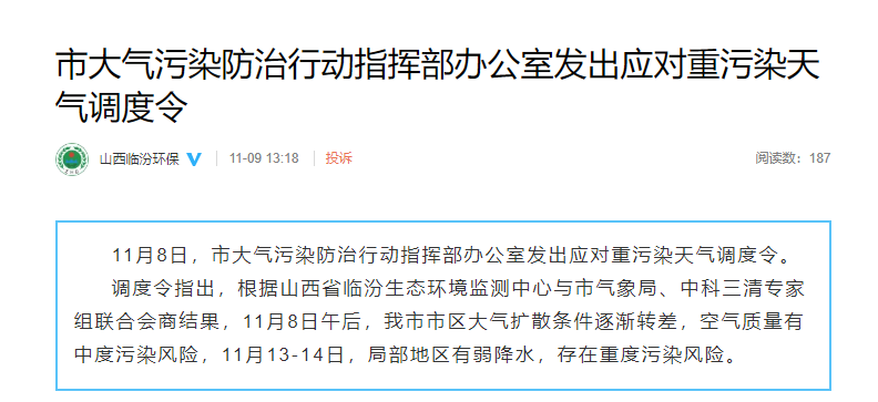 山西臨汾市大氣污染防治行動指揮部辦公室發(fā)出應對重污染天氣調度令。