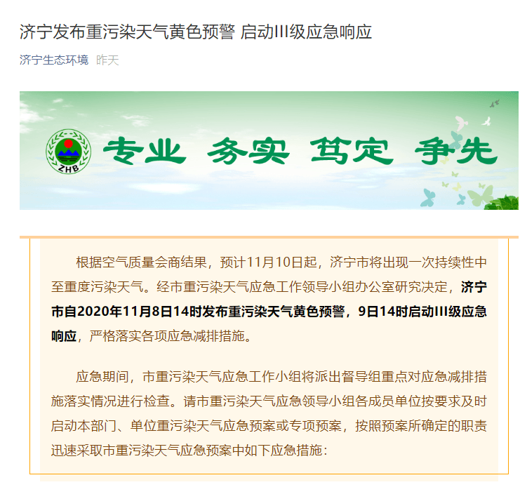 山東濟(jì)寧、日照2市啟動(dòng)重污染天氣黃色預(yù)警Ⅲ級(jí)應(yīng)急響應(yīng) !