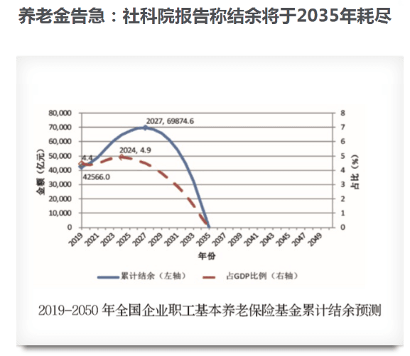 中國(guó)社科院世界社保研究中心發(fā)布《中國(guó)養(yǎng)老金精算報(bào)告2019~2050》(以下簡(jiǎn)稱(chēng)《報(bào)告》)?!秷?bào)告》預(yù)測(cè),未來(lái)30年我國(guó)的制度贍養(yǎng)率翻倍,2019年當(dāng)期結(jié)余總額為1062.9億元,不過(guò)到2028年,當(dāng)期結(jié)余可能會(huì)首次出現(xiàn)負(fù)數(shù),為負(fù)1181.3億元?!秷?bào)告》同時(shí)指出,城鎮(zhèn)職工基本養(yǎng)老保險(xiǎn)基金累計(jì)結(jié)余到2027年有望達(dá)到峰值6.99萬(wàn)億元,然后開(kāi)始下降,到2035年有耗盡累計(jì)結(jié)余的可能性。