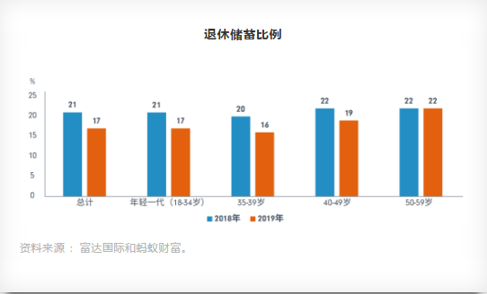 根據(jù)調(diào)查報(bào)告顯示,盡管越來(lái)越多的人開(kāi)始為退休儲(chǔ)蓄,但他們的儲(chǔ)蓄額在下降 。2018年人們每月儲(chǔ)蓄月收入的21%(1,389元)作為退休準(zhǔn)備,但2019年這一比例降卻至17%(1,052元)。