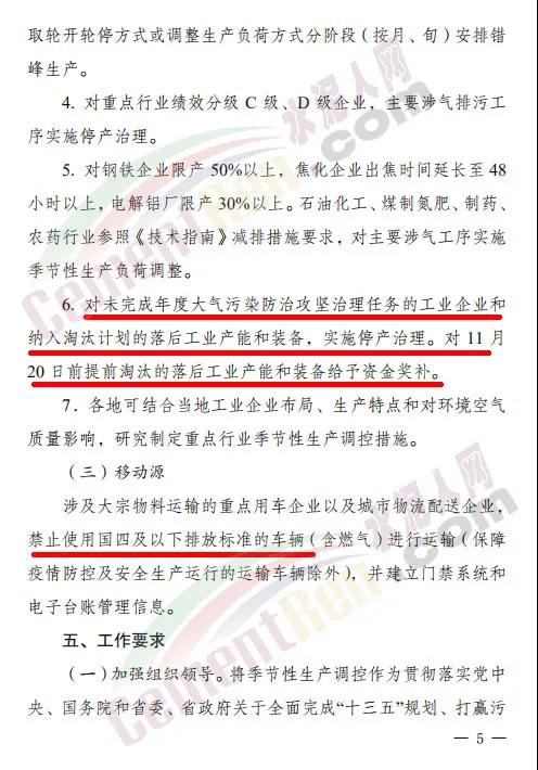 4.對未完成年度大氣污染防治攻堅治理任務的工業(yè)企業(yè)和納入淘汰計劃的落后工業(yè)產(chǎn)能和裝備,實施停產(chǎn)治理。對 11 月20 日前提前淘汰的落后工業(yè)產(chǎn)能和裝備給予資金獎補。