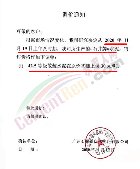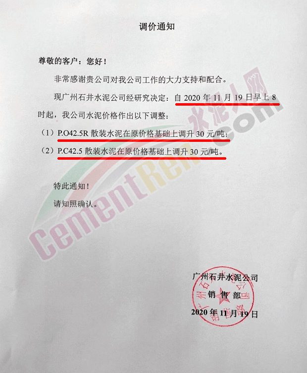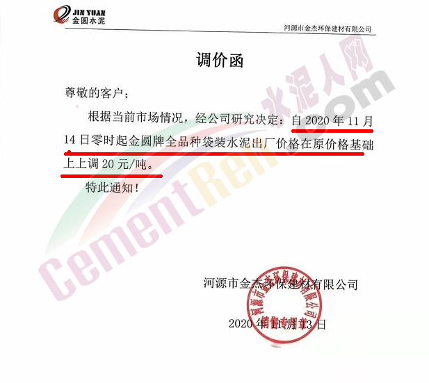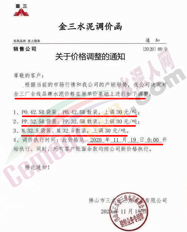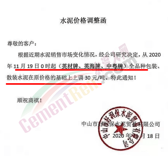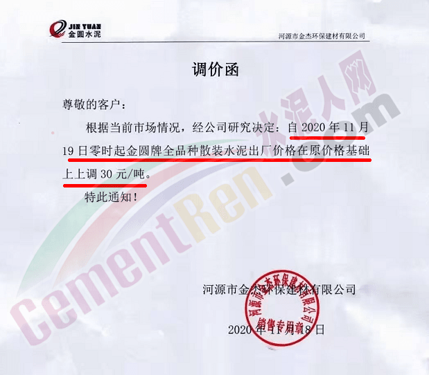 金圓水泥通知,11月19日0時(shí)各品種散裝水泥上調(diào)30元/噸,本月14日,金圓水泥還曾上調(diào)全品種袋裝水泥20元/噸。