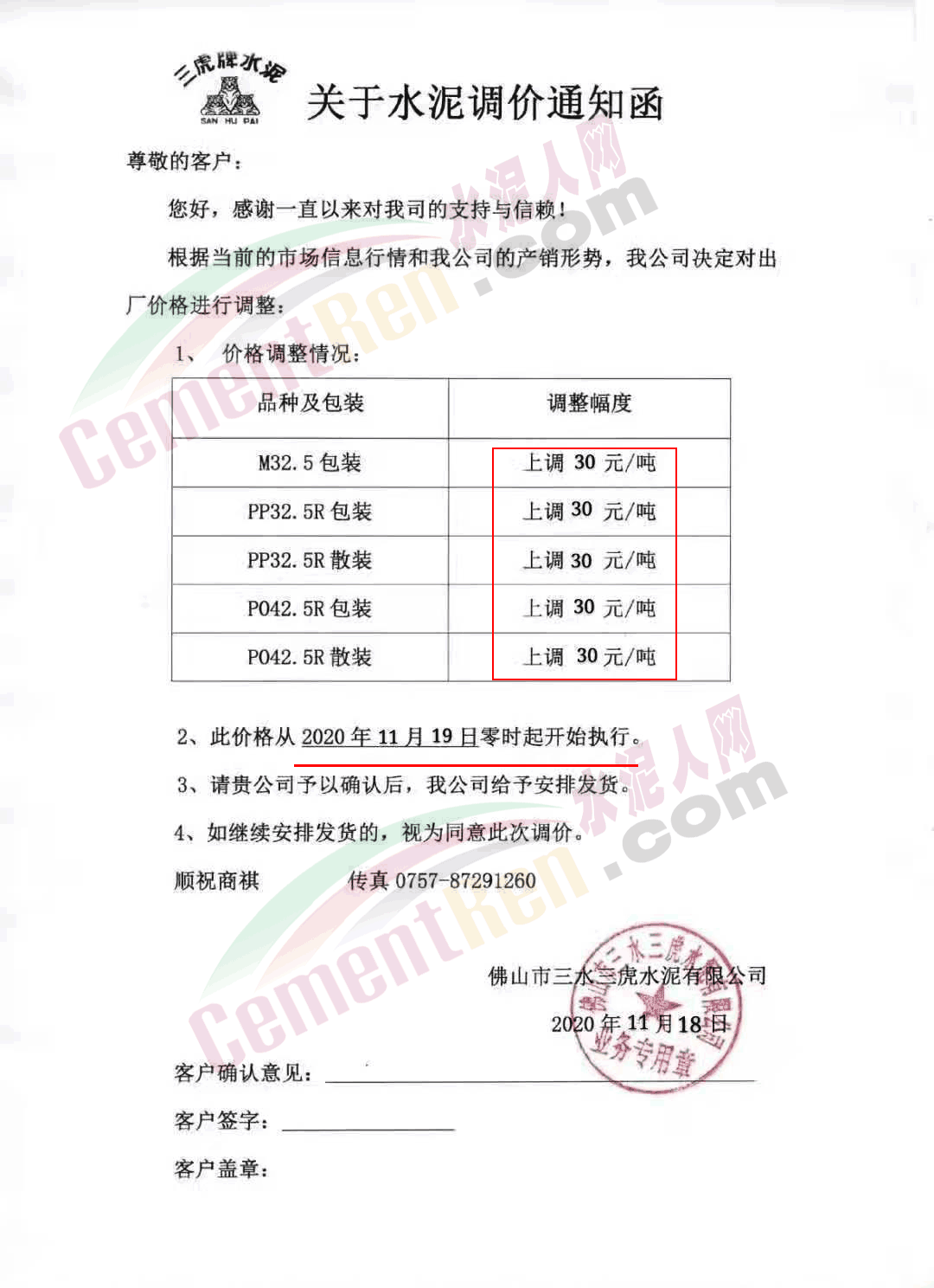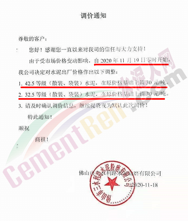 佛山市三水三虎水泥通知自今日(19日)零時(shí)起各標(biāo)號(hào)水泥上調(diào)30元/噸。