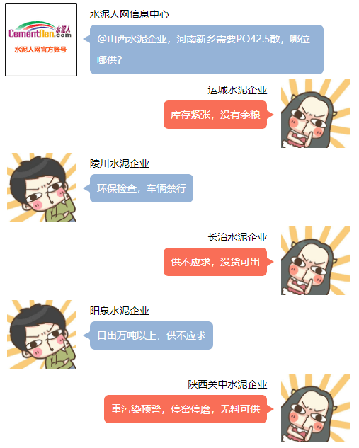 河南新鄉(xiāng)某企業(yè)求助水泥人網(wǎng)信息中心,希望能夠?qū)由轿魉嗥髽I(yè)。山西運(yùn)城某企業(yè)負(fù)責(zé)對(duì)水泥人網(wǎng)表示,”庫(kù)存告急,沒(méi)有余糧”。陵川水泥企業(yè)回復(fù)環(huán)保檢查車(chē)輛禁行。山西陽(yáng)泉區(qū)域回復(fù)日出萬(wàn)噸以上,供不應(yīng)求,沒(méi)有庫(kù)存,產(chǎn)多少銷(xiāo)多少,還有排隊(duì)車(chē)等候。陜西關(guān)中水泥企業(yè)回復(fù),重污染天氣,停窯停磨,無(wú)料可供... ...