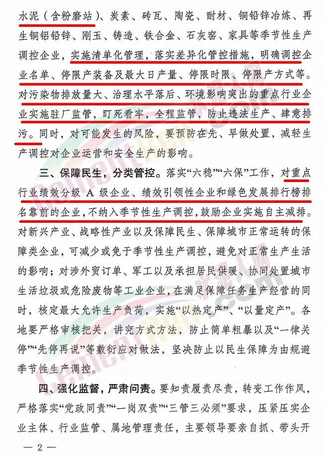 對環(huán)境影響突出的水泥(含特種水泥, 含粉磨站)、炭素、磚瓦、陶瓷、耐材、剛玉、鑄造、石灰窯、 家具等9個(gè)重點(diǎn)行業(yè),實(shí)施差異化生產(chǎn)調(diào)控;對鋼鐵、電解鋁、 制藥、農(nóng)藥等4個(gè)重點(diǎn)行業(yè)實(shí)施生產(chǎn)負(fù)荷調(diào)整。