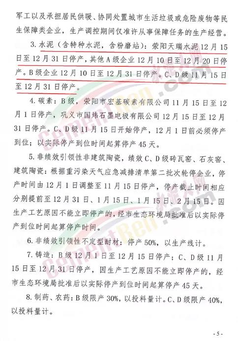 3.水泥(含特種水泥,含粉磨站):滎陽天瑞水泥12月15 日至12月31日停產(chǎn),其他A級企業(yè)12月10日至12月20日停產(chǎn)。B級企業(yè)12月10日至12月31日停產(chǎn)。C、D級11月15日 至12月31日停產(chǎn)。
