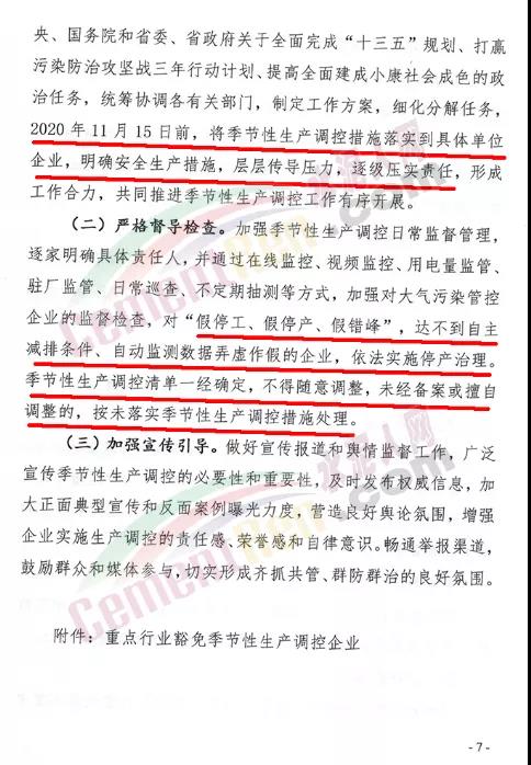 嚴(yán)格督導(dǎo)檢查。加強(qiáng)季節(jié)性生產(chǎn)調(diào)控日常監(jiān)督管理, 逐家明確具體責(zé)任人,并通過在線監(jiān)控、視頻監(jiān)控、用電量監(jiān)管、 駐廠監(jiān)管、日常巡查、不定期抽測等方式,加強(qiáng)對大氣污染管控 企業(yè)的監(jiān)督檢查,對“假停工、假停產(chǎn)、假錯(cuò)峰”,達(dá)不到自主減排條件、自動(dòng)監(jiān)測數(shù)據(jù)弄虛作假的企業(yè),依法實(shí)施停產(chǎn)治理。季節(jié)性生產(chǎn)調(diào)控清單一經(jīng)確定,不得隨意調(diào)整,未經(jīng)備案或擅自調(diào)整的,按未落實(shí)季節(jié)性生產(chǎn)調(diào)控措施處理。重點(diǎn)行業(yè)豁免季節(jié)性生產(chǎn)調(diào)控企業(yè)名單列表中20家企業(yè)不包括水泥行業(yè)。 通知全文如下: