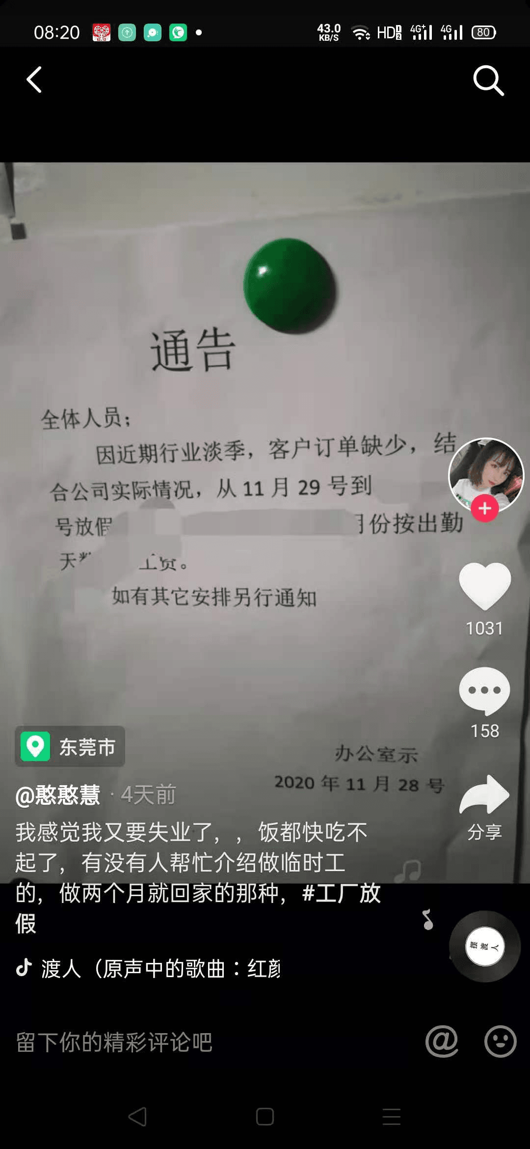 外貿(mào)企業(yè)淡季到來,放假來的比往年早?據(jù)水泥人網(wǎng)了解,近期外貿(mào)工廠通知提前放假的情況并不在少數(shù)。溫州一鞋廠發(fā)布放假通知,稱因全球疫情影響,鞋廠生產(chǎn)需作調(diào)整,決定從2020年12月1日暫停生產(chǎn),提前放年假。通知還稱,從2020年12月1日與員工協(xié)商簽訂“暫停勞動合同”關(guān)系協(xié)議(即停薪留職)。