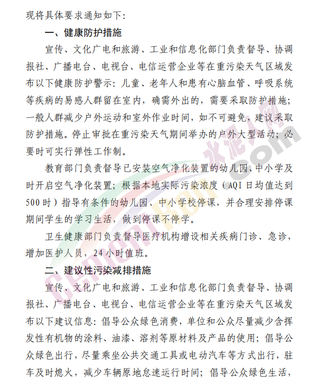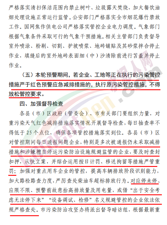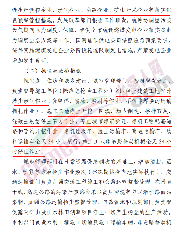 長期停產(chǎn)及未建成企業(yè)復(fù)產(chǎn)或試生產(chǎn)前,須向縣(區(qū))、市兩級污染防治攻堅(jiān)辦報(bào)告, 經(jīng)同意后方可進(jìn)行。對應(yīng)納入減排清單而未納入減排清單的涉氣企業(yè),一律實(shí)施停產(chǎn)??貕m辦,住房和城鄉(xiāng)建設(shè)、城市管理部門,按照職責(zé)分工, 負(fù)責(zé)督導(dǎo)施工單位(除應(yīng)急搶險(xiǎn)工程外)立即停止建筑工地室外涉塵涉氣作業(yè)(含電焊、噴涂、粉刷等作業(yè),不含非焊接的鋼筋捆扎作業(yè)),施工工地停止開挖、回填、場內(nèi)倒運(yùn)、摻拌石灰、混凝土剔鑿等土石方作業(yè),停止城市建筑拆遷、建筑工程配套道路和管溝開挖作業(yè);建筑垃圾車、渣土運(yùn)輸車、商砼運(yùn)輸車、物料運(yùn)輸車全天 24 小時(shí)禁行,施工工地非道路移動機(jī)械全天 24 小時(shí)停止作業(yè)。城市管理部門在日常道路保潔頻次的基礎(chǔ)上,增加清掃、灑水、噴霧等防治揚(yáng)塵作業(yè)頻次(冰凍期結(jié)合當(dāng)?shù)貙?shí)際執(zhí)行)。交通運(yùn)輸部門負(fù)責(zé)加強(qiáng)交通工程施工和公路運(yùn)輸監(jiān)督管理,在國省干線、高速公路的污染嚴(yán)重路段采取高壓沖洗等方式清理路面污染物,加強(qiáng)公路運(yùn)輸揚(yáng)塵監(jiān)督管理。自然資源和規(guī)劃部門負(fù)責(zé)督促露天礦山及山水林田湖草項(xiàng)目停止一切產(chǎn)生揚(yáng)塵的生產(chǎn)活動。水利部門負(fù)責(zé)水利工程施工場地及施工運(yùn)輸車輛、非道路移動機(jī)械的揚(yáng)塵控制。礦山(含煤礦)、洗煤廠、港口碼頭、物流(除民生保障類)等涉及大宗原料和產(chǎn)品運(yùn)輸(日常車輛進(jìn)出量超過10 輛次)的單位應(yīng)停止使用國四及以下重型載貨汽車(含燃?xì)? 進(jìn)行運(yùn)輸(特種車輛、危化品車輛等除外)。交通運(yùn)輸部門負(fù)責(zé)增加公共交通運(yùn)輸運(yùn)力,保障市民出行。本輪預(yù)警期間,若企業(yè)、工地等正在執(zhí)行的污染管控措施嚴(yán)于紅色預(yù)警應(yīng)急減排措施的,執(zhí)行原污染管控措施,不得放松管控要求。各縣(市)區(qū)政府(管委會)、市有關(guān)部門要組織力量,對重污染天氣紅色減排措施落實(shí)情況開展督導(dǎo)檢查,每日抽查率不得低于 25 個(gè)點(diǎn)位,確保各項(xiàng)管控措施落實(shí)到位。各縣(市)區(qū)對管控期間每日通報(bào)問題企業(yè),特別是多次被通報(bào)仍未采取減排措施和涉嫌擅自停運(yùn)污染防治設(shè)施規(guī)避監(jiān)管的企業(yè),要及時(shí)查封扣押,從快立案,并綜合運(yùn)用按日計(jì)罰、移送拘留等措施嚴(yán)管重罰;加強(qiáng)對重點(diǎn)用車企業(yè)的管控,提高車輛排放階段識別能力, 加大路檢路查力度,嚴(yán)厲查處柴油車超標(biāo)排放行為。對應(yīng)停未停、 應(yīng)限不限、預(yù)警前故意抬高排放量及用電量,或借“出于安全考慮無法停下來”“設(shè)備調(diào)試、檢修”名義規(guī)避管控的企業(yè)依法依規(guī)嚴(yán)格查處。