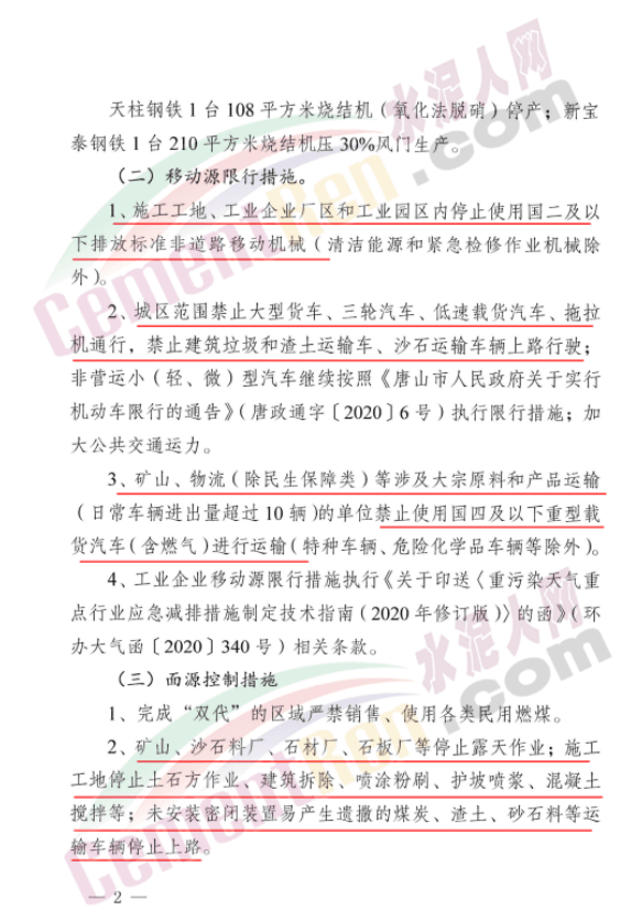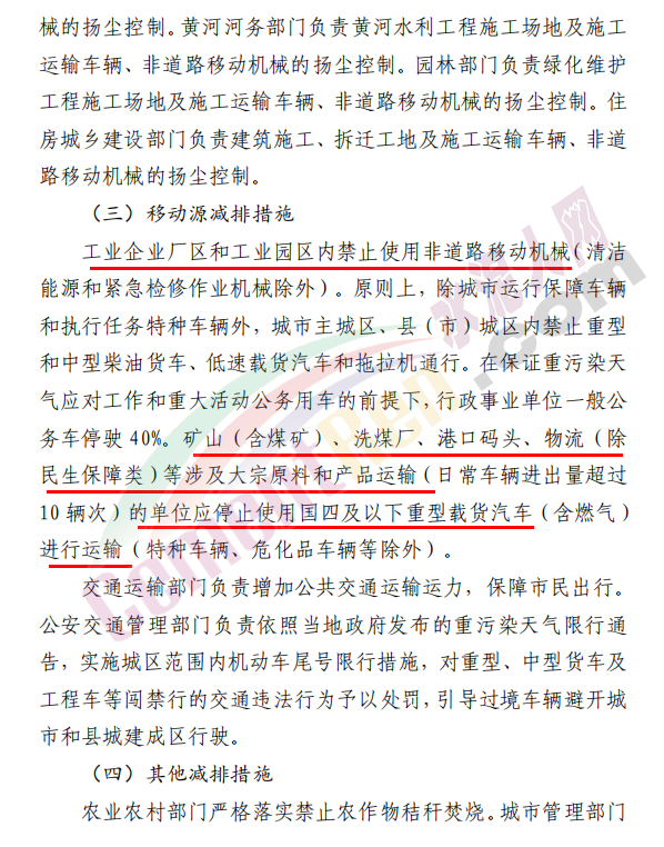 移動源限行措施要求:1、施工工地、工業(yè)企業(yè)廠區(qū)和工業(yè)園區(qū)內(nèi)停止使用國二及以下排放標(biāo)準(zhǔn)非道路移動機(jī)械。2、城區(qū)范圍禁止大型貨車、三輪汽車、低速載貨汽車、拖拉機(jī)通行,禁止建筑垃圾和渣土運(yùn)輸車、沙石運(yùn)輸車輛上路行駛。3、礦山、物流等涉及大宗原料和產(chǎn)品運(yùn)輸?shù)膯挝唤故褂脟募耙韵轮匦洼d貨汽車進(jìn)行運(yùn)輸。面源控制措施要求:礦山、沙石料廠、石材廠、石板廠等停止露天作業(yè);施工工地停止土石方作業(yè)、建筑拆除、噴涂粉刷、護(hù)坡噴漿、混凝土攪拌等;未安裝密閉裝置易產(chǎn)生遺撒的煤炭、渣土、砂石料等運(yùn)輸車輛停止上路。同時(shí)要求: