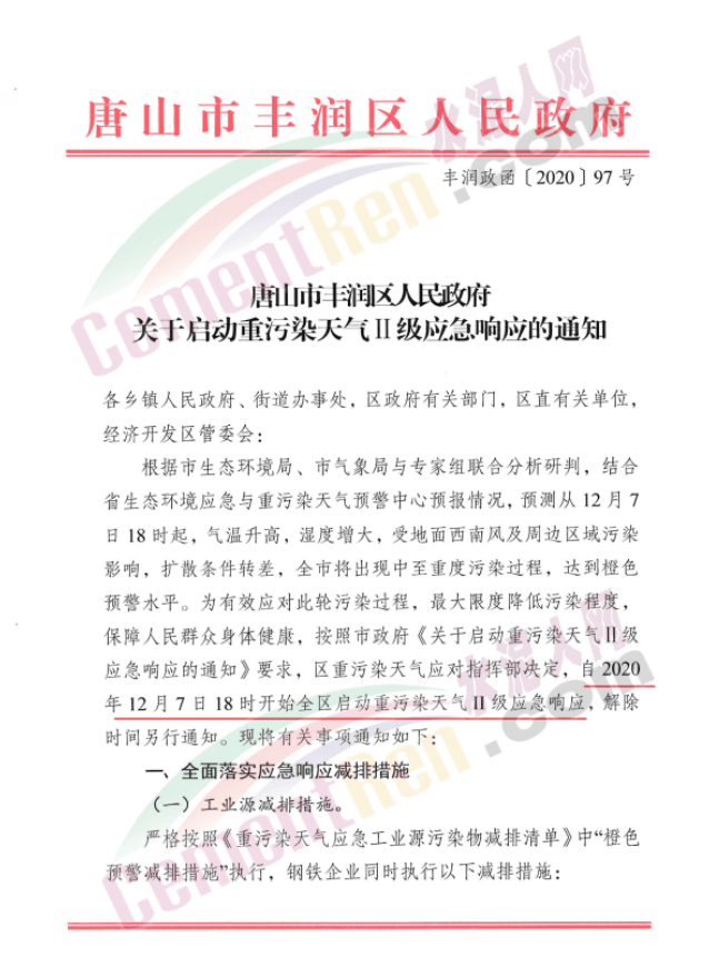 同期,河北唐山市豐潤區(qū)人民政府發(fā)布《《關(guān)于啟動重污染天氣II級應(yīng)急響應(yīng)的通知》稱,自12 月7日18時(shí)發(fā)布重污染天氣橙色預(yù)警,并于12月7日18時(shí)啟動Ⅱ級應(yīng)急響應(yīng)。 工業(yè)源減排要求,嚴(yán)格按照《重污染天氣應(yīng)急工業(yè)源污染物減排清單》中“橙色預(yù)警減排措施”執(zhí)行。