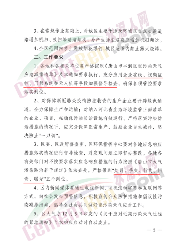 3、區(qū)委、區(qū)政府督查室、區(qū)環(huán)保指揮中心要對各地應(yīng)急響應(yīng)措施落實(shí)情況進(jìn)行督導(dǎo)檢查,對發(fā)現(xiàn)問題立即督辦整改。各地各有關(guān)部門對不按要求落實(shí)應(yīng)急響應(yīng)措施的行為按照《唐山市大氣污染防治若干規(guī)定》依法查處,嚴(yán)格做到“處罰、移交、行拘、問 責(zé)、曝光”五個(gè)到位。唐山豐潤區(qū)大氣辦12月5日印發(fā)的《關(guān)于應(yīng)對近期污染天氣過程的緊急通知》自本響應(yīng)啟動時(shí)自動廢止。