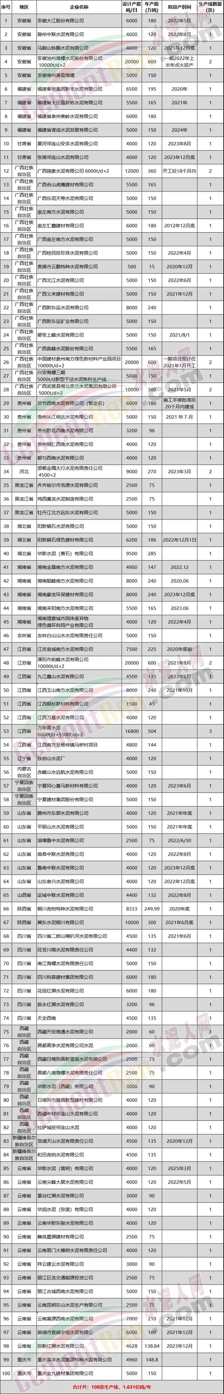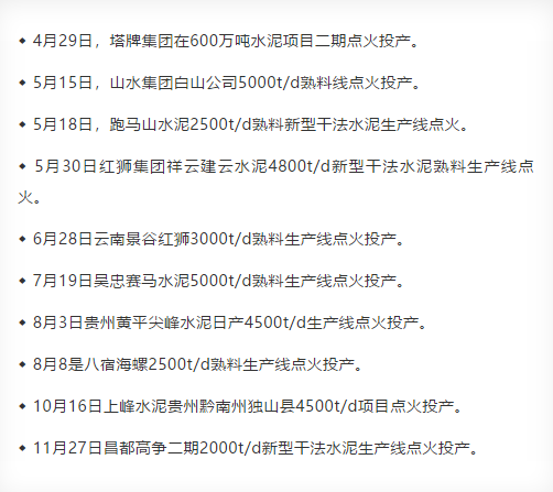 據(jù)水泥人網(wǎng)不完全統(tǒng)計(jì),2020年以來,已投產(chǎn)10條水泥熟料生產(chǎn)線分布在廣東、四川、吉林、云南、貴州、寧夏、西藏等區(qū)域,其產(chǎn)能達(dá)到1614萬噸,部分項(xiàng)目如下: