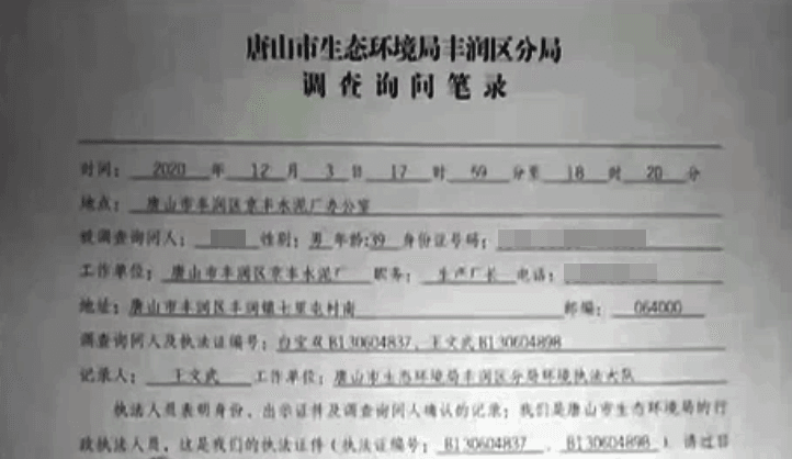 日前,河北省唐山市生態(tài)環(huán)境局夜查豐潤區(qū)京豐水泥廠,發(fā)現(xiàn)有生產跡象和環(huán)境污染問題后,遭到該企業(yè)人員尾隨、跟蹤、阻礙,并辱罵環(huán)保執(zhí)法人員。