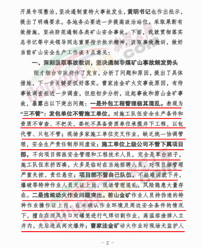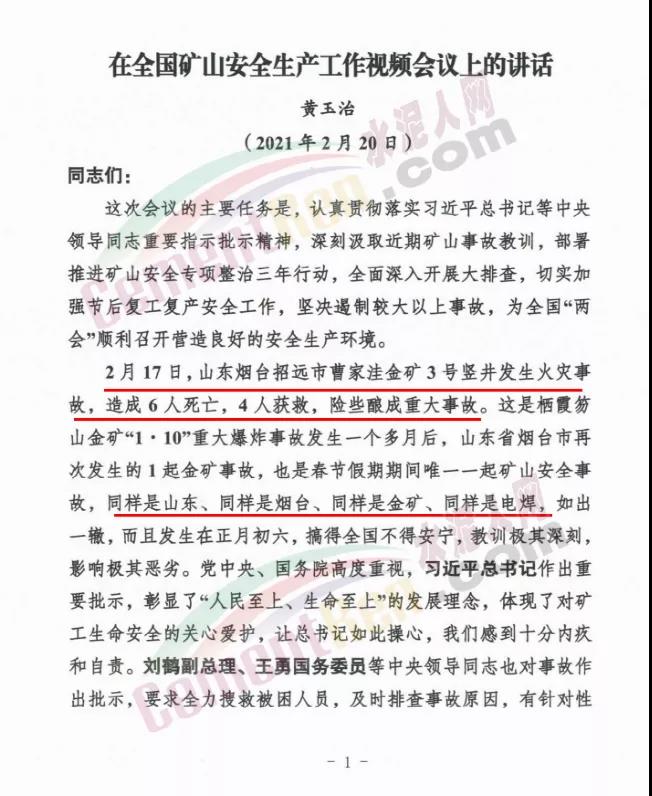 水泥人網(wǎng)通訊員消息,近日,應(yīng)急管理部副部長、國家礦山安監(jiān)局局長黃玉治在全國礦山安全生產(chǎn)工作視頻會(huì)議上發(fā)表講話時(shí)提到,2月17日,山東煙臺(tái)招遠(yuǎn)市曹家洼金礦3號(hào)豎井發(fā)生火災(zāi)事故,造成6人死亡,4人獲救,險(xiǎn)些釀成重大事故。這是繼棲霞笏山金礦“1?10”重大爆炸事故發(fā)生一個(gè)多月后,山東省再次發(fā)生的1起金礦事故,也是春節(jié)假期期間唯一一起礦山安全事故,同樣是山東、同樣是煙臺(tái)、同樣是金礦、同樣是電焊,如出一轍,而且發(fā)生在正月初六,搞得全國不得安寧,教訓(xùn)極其深刻,影響極其惡劣。
