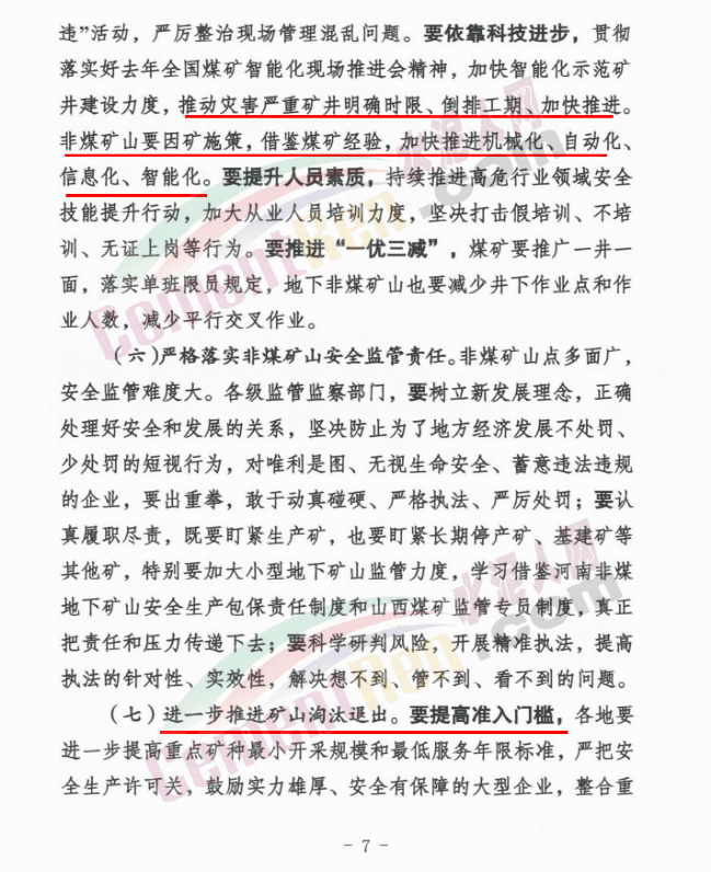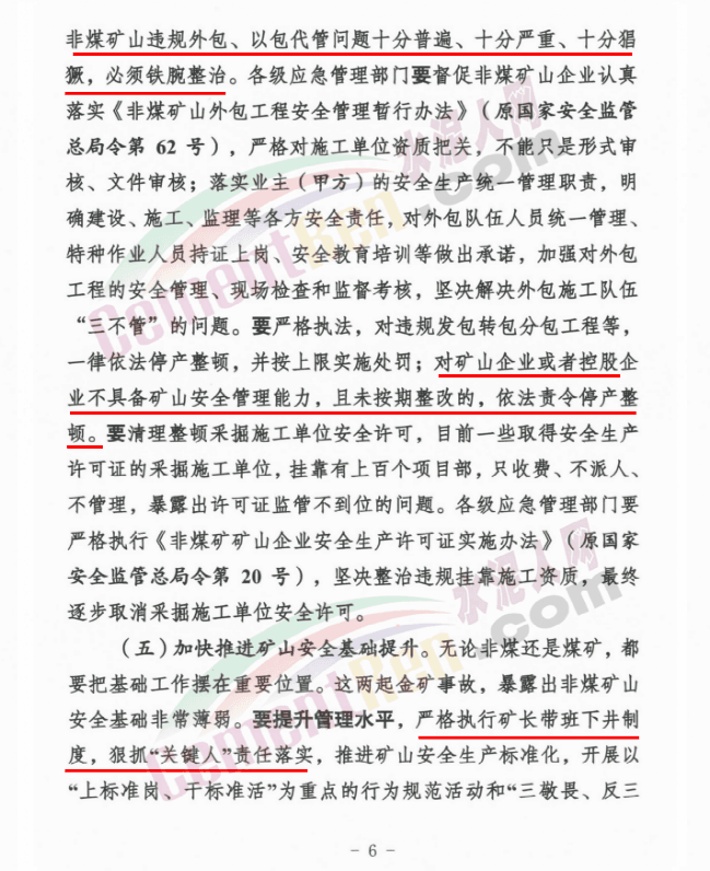 針對(duì)于礦山事故多發(fā),國務(wù)院及應(yīng)急管理部相關(guān)領(lǐng)導(dǎo)要求以清理整治違規(guī)外包隊(duì)伍為突破口,立即組織對(duì)地下非煤礦山和尾礦庫開展全系統(tǒng)各環(huán)節(jié)大排查,做到高風(fēng)險(xiǎn)礦山自查自改、上級(jí)企業(yè)檢查下級(jí)礦山、市縣監(jiān)管部門督查礦山“三個(gè)百分百”。