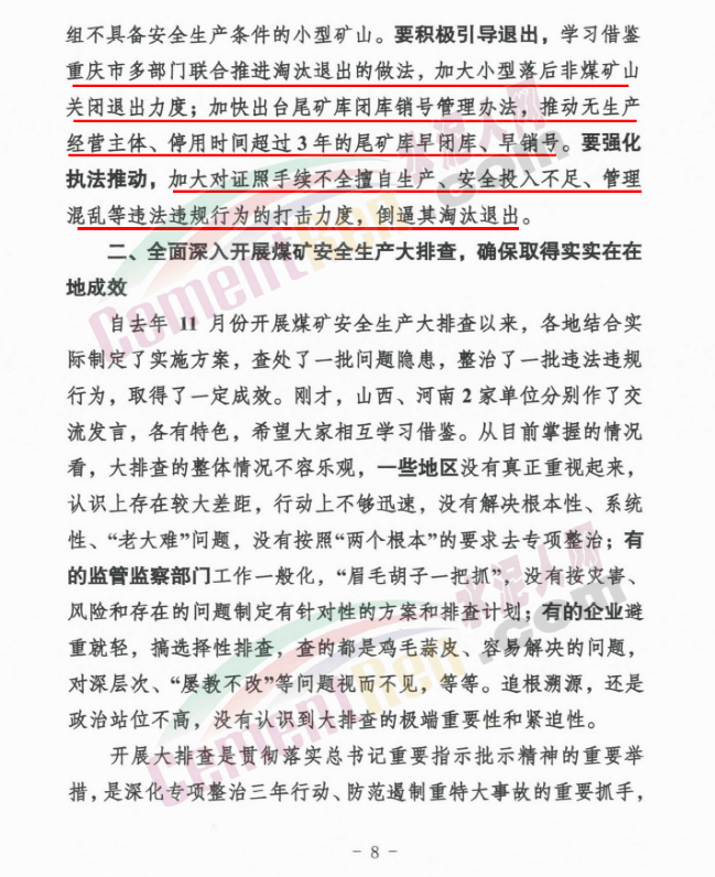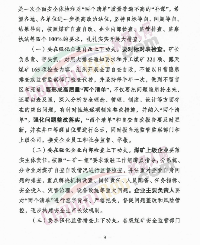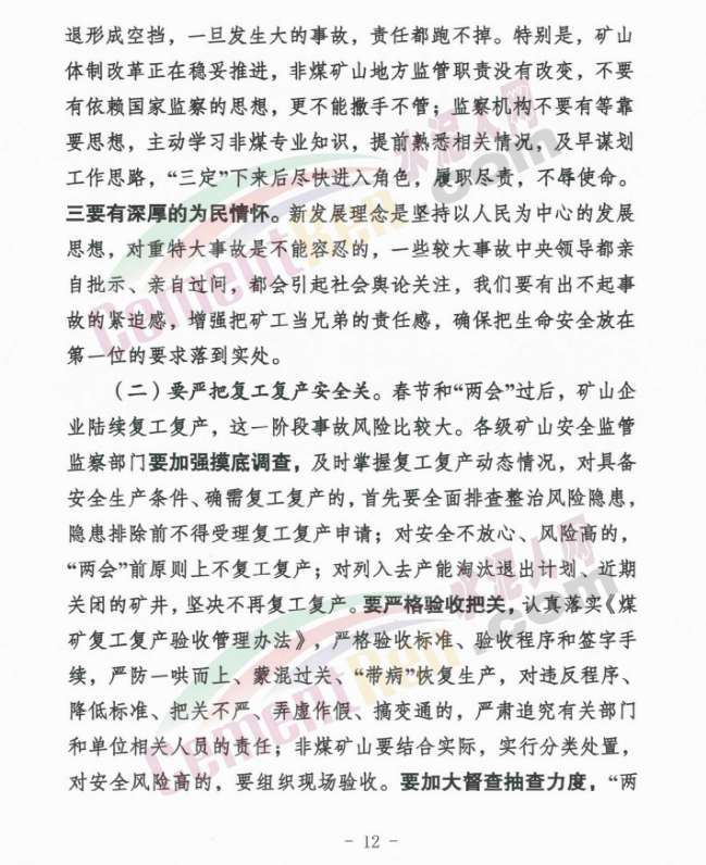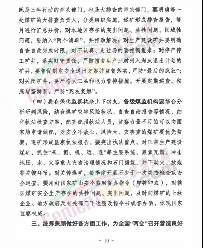 要全面深入開展煤礦安全生產(chǎn)大排查,深刻認(rèn)識(shí)其重要性和緊迫性,在強(qiáng)化自查自改、企業(yè)內(nèi)部檢查、監(jiān)管排查、監(jiān)察執(zhí)法上下功夫,確保取得實(shí)實(shí)在在的成效。要統(tǒng)籌兼顧做好各方面工作,著力轉(zhuǎn)變思想觀念,錘煉隊(duì)伍過硬作風(fēng),嚴(yán)把節(jié)后復(fù)工復(fù)產(chǎn)安全關(guān),為全年工作起好步、開好局。