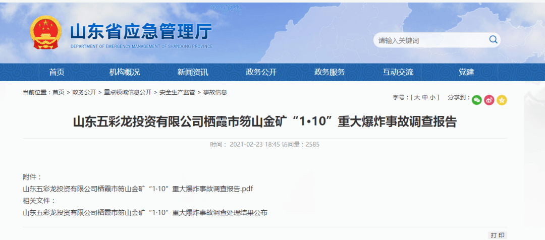 23日,山東省應(yīng)急管理廳在其官網(wǎng)公布山東五彩龍投資有限公司棲霞市笏山金礦“1·10”重大爆炸事故調(diào)查報(bào)告全文。