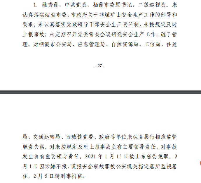 姚秀霞,棲霞市委原書記,二級(jí)巡視員。未認(rèn)真落實(shí)煙臺(tái)市委、市政府關(guān)于非煤礦山安全生產(chǎn)工作的部署和要求;未認(rèn)真落實(shí)黨政領(lǐng)導(dǎo)干部安全生產(chǎn)責(zé)任制,未按規(guī)定及時(shí)上報(bào)事故;未定期召開黨委常委會(huì)議研究安全生產(chǎn)工作;疏于管理,對(duì)棲霞市公安局、應(yīng)急管理局、自然資源局、工信局、住建局、交通運(yùn)輸局、西城鎮(zhèn)黨委、政府等單位未認(rèn)真履行相應(yīng)監(jiān)管職責(zé)失察。對(duì)未按規(guī)定及時(shí)上報(bào)事故負(fù)有主要領(lǐng)導(dǎo)責(zé)任,對(duì)事故發(fā)生負(fù)有重要領(lǐng)導(dǎo)責(zé)任。2021年1月15日被山東省委免職。2月1日因涉嫌不報(bào)、謊報(bào)安全事故罪被公安機(jī)關(guān)指定居所監(jiān)視居住,2月5日轉(zhuǎn)刑事拘留。