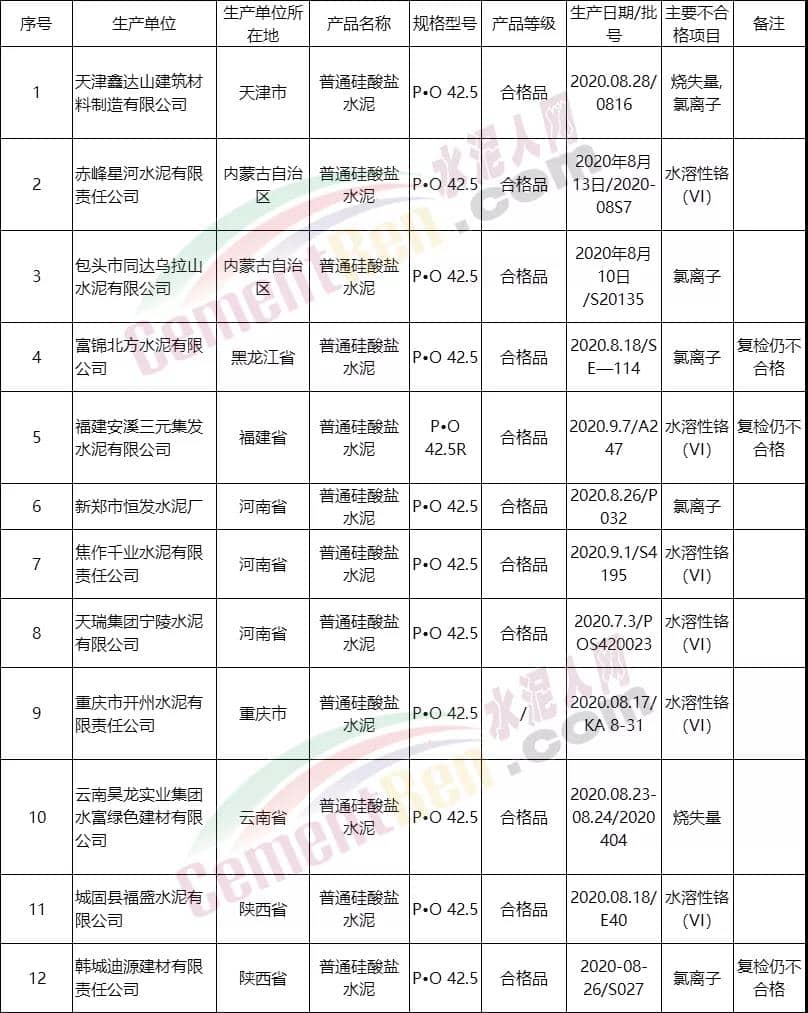 12個(gè)批次PO42.5水泥國抽不合格