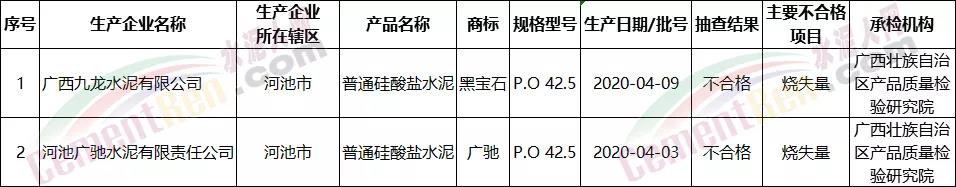 日前,廣西壯族自治區(qū)市場監(jiān)督管理局發(fā)布包括水泥產(chǎn)品在內(nèi)的25種產(chǎn)品質(zhì)量廣西監(jiān)督抽查情況的通報(bào)情況顯示,廣西九龍水泥有限公司黑寶石牌P.O42.5、河池廣馳水泥有限責(zé)任公司廣馳牌P.O42.5水泥各一個(gè)批次檢驗(yàn)結(jié)果為不合格,不合格項(xiàng)目涉及燒失量。