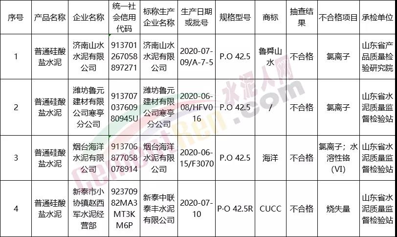 山東省市場監(jiān)督管理局2020年水泥產(chǎn)品質(zhì)量省級(jí)監(jiān)督抽查結(jié)果, 發(fā)現(xiàn)4家企業(yè)的4批次PO42.5產(chǎn)品不符合相關(guān)標(biāo)準(zhǔn)的要求,不合格項(xiàng)目為氯離子、燒失量、水溶性鉻(VI)等項(xiàng)目。